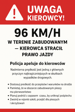 W środę, 10 września 2025 roku ok. 16.00, policjanci zatrzymali 44-letniego kierowcę kia, który rażąco przekroczył dozwoloną prędkość na drodze powiatowej w miejscowości Liniewo. Mężczyzna jechał 96 km/h w obszarze zabudowanym, czyli aż o 56 km/h więcej niż pozwalają przepisy. Zgodnie z obowiązującymi regulacjami kierowca stracił prawo jazdy na okres 3 miesięcy. Dodatkowo został ukarany mandatem w wysokości 1500 zł oraz 13 punktami karnymi.