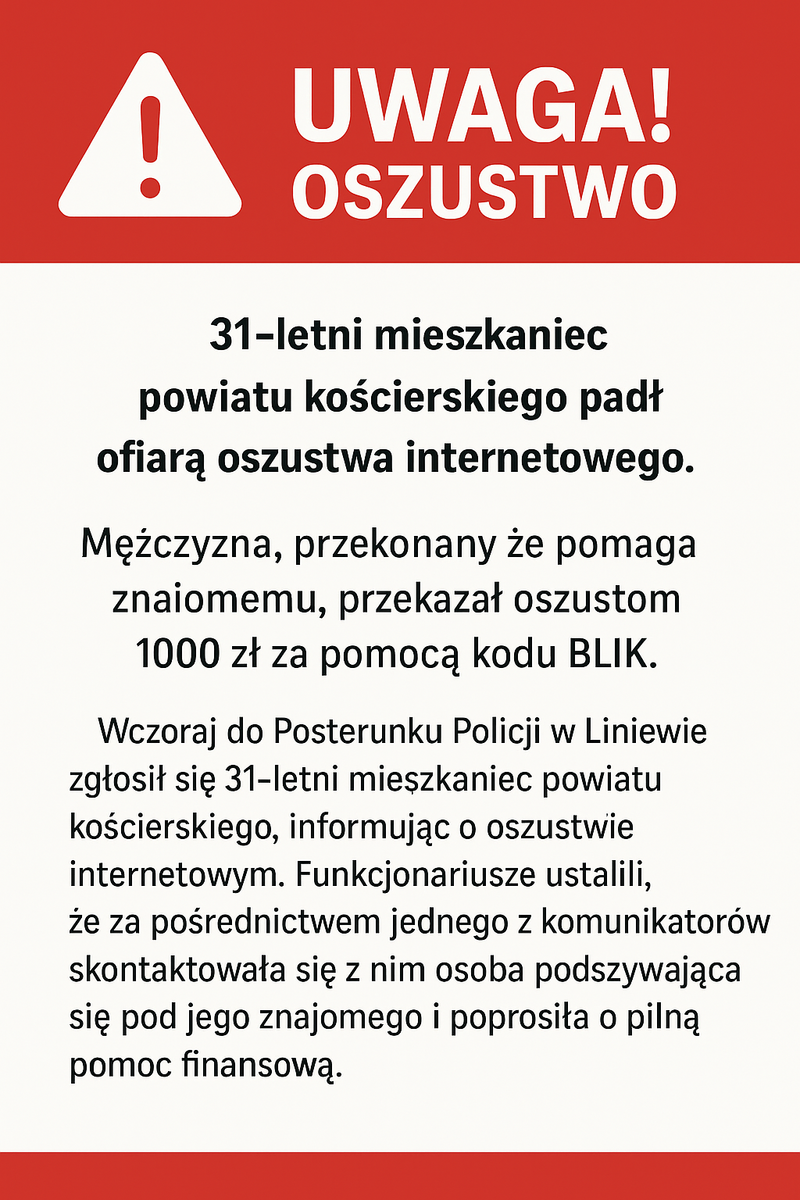 Wczoraj do Posterunku Policji w Liniewie zgłosił się 31-letni mieszkaniec powiatu kościerskiego, informując o oszustwie internetowym. Funkcjonariusze ustalili, że za pośrednictwem jednego z komunikatorów skontaktowała się z nim osoba podszywająca się pod jego znajomego i poprosiła o pilną pomoc finansową. Mężczyzna, nie weryfikując otrzymanej wiadomości, przelał oszustom 1000 zł za pomocą kodu BLIK. Dopiero po dokonaniu transakcji skontaktował się bezpośrednio ze swoim znajomym i zorientował się, że padł ofiarą oszustwa.