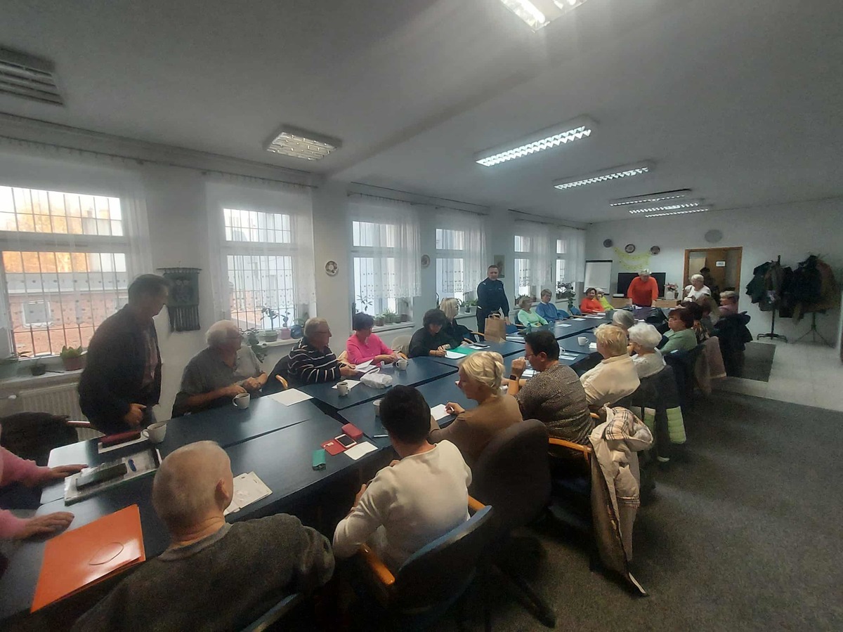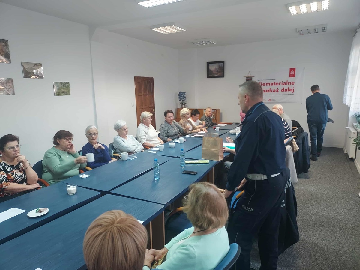 Policjanci z Komendy Powiatowej Policji w Kościerzynie gościli w Kościerskim Domu Kultury, gdzie wzięli udział w spotkaniu z seniorami. Tematem rozmów były przede wszystkim zagrożenia związane z przestępstwami metodą „na wnuczka” oraz „na funkcjonariusza”. Podczas spotkania funkcjonariusze szczegółowo omówili mechanizmy działania oszustów, którzy często wykorzystują ufność i dobre serce osób starszych. Policjanci apelowali, by zachować ostrożność, nie przekazywać pieniędzy nieznajomym oraz każdą podejrzaną sytuację zgłaszać służbom. W trakcie spotkania przypomniano również o możliwości korzystania z Krajowej Mapy Zagrożeń Bezpieczeństwa, która umożliwia anonimowe zgłaszanie niepokojących sytuacji bez wychodzenia z domu. Policjanci zaprezentowali także aplikację „Moja Komenda”, ułatwiającą kontakt z dzielnicowym w dowolnym miejscu i czasie. Nie zabrakło także rozmów o bezpieczeństwie w ruchu drogowym, w tym o obowiązku i znaczeniu noszenia elementów odblaskowych, zwłaszcza po zmroku.
