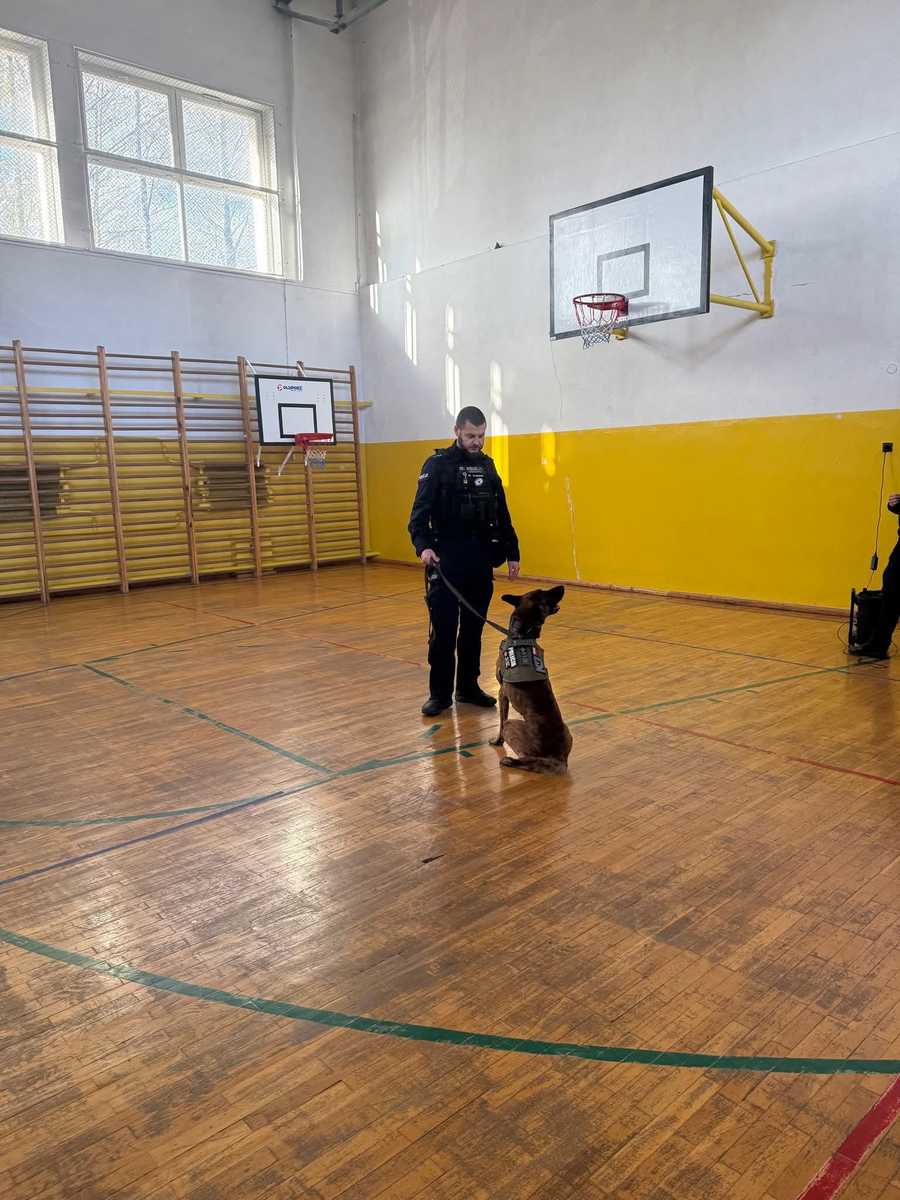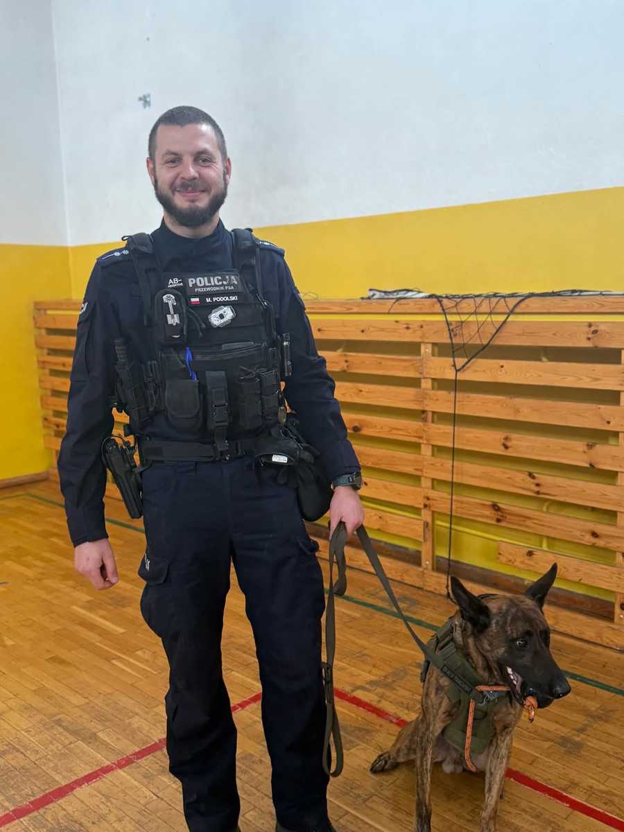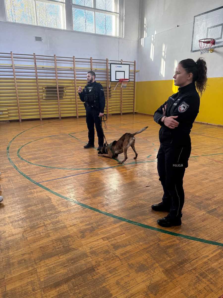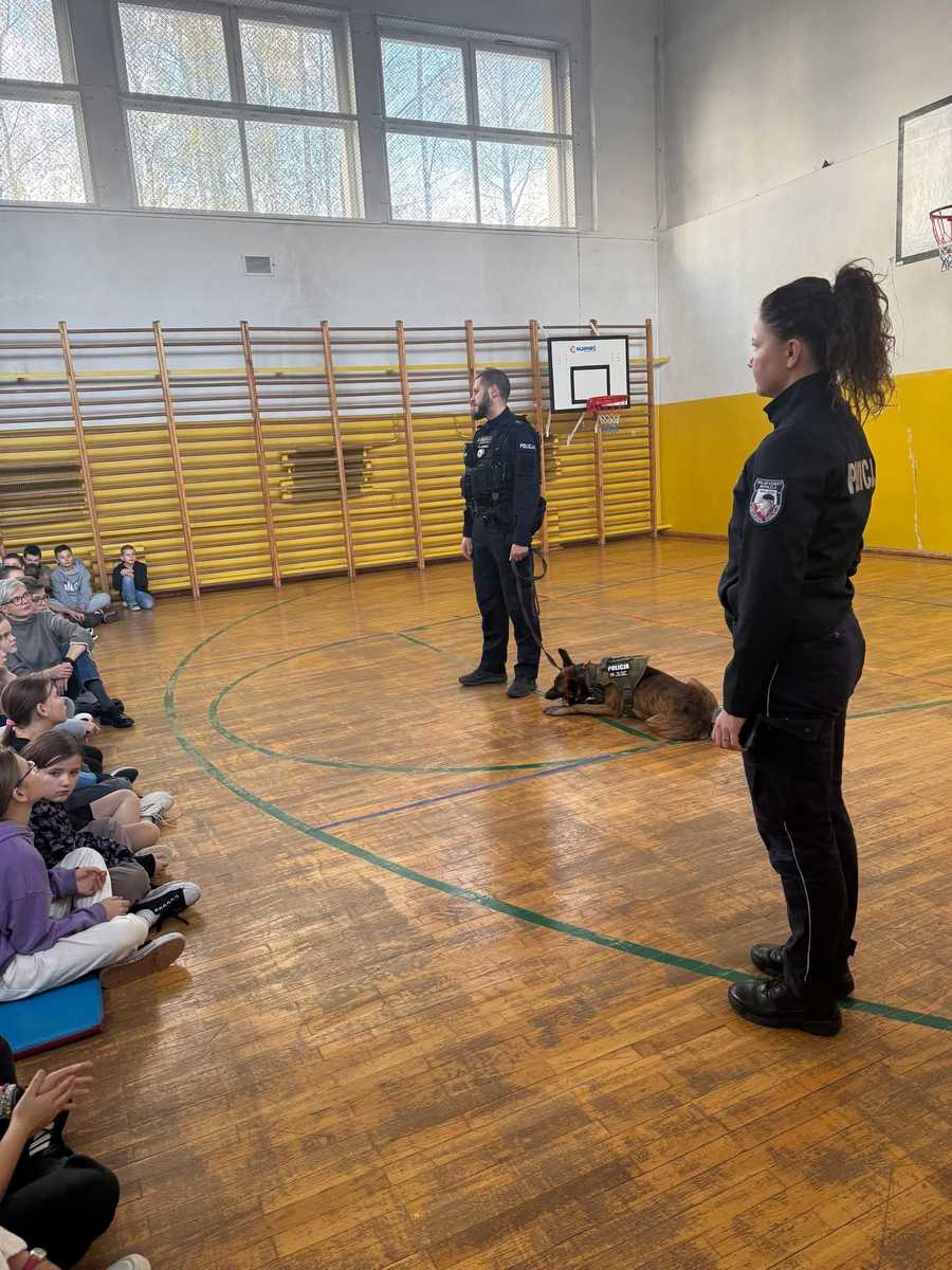 Podczas spotkania funkcjonariusze opowiedzieli uczniom o codziennej służbie w Policji, a szczególnie o roli psów policyjnych, które na co dzień pomagają w poszukiwaniu osób zaginionych, wykrywaniu niebezpiecznych substancji oraz dbaniu o porządek publiczny. Największe zainteresowanie wzbudził oczywiście pokaz umiejętności czworonoga. Uczniowie mogli zobaczyć, jak reaguje on na komendy swojego przewodnika i jak doskonale z nim współpracuje. Wszyscy byli pod ogromnym wrażeniem posłuszeństwa, odwagi i inteligencji psa służbowego. Nie zabrakło także rozmowy o bezpieczeństwie – zarówno w kontaktach z innymi ludźmi, jak i ze zwierzętami. Spotkanie było nie tylko interesujące, ale również bardzo pouczające i inspirujące.