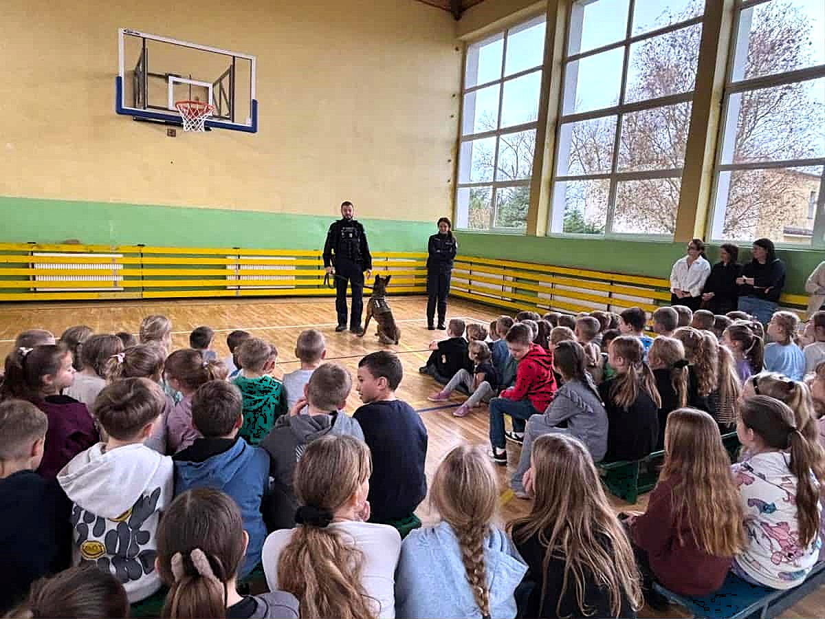 14 listopada 2025 roku w Szkole Podstawowej w Starych Polaszkach odbyło się wyjątkowe spotkanie z policjantką, policjantem oraz ich czworonożnym partnerem – psem służbowym. Uczniowie mieli okazję z bliska poznać specyfikę pracy Policji, dowiedzieć się, jak wygląda służba z udziałem psów policyjnych, a także zobaczyć pokaz ich umiejętności. Podczas spotkania funkcjonariusze opowiadali o codziennej pracy w Policji, ze szczególnym uwzględnieniem roli, jaką pełnią psy służbowe. Wyjaśnili, w jaki sposób czworonogi pomagają w poszukiwaniu osób zaginionych, wykrywaniu niebezpiecznych substancji oraz wspierają działania związane z zapewnianiem bezpieczeństwa i porządku publicznego. Największe zainteresowanie wzbudził oczywiście pokaz umiejętności policyjnego psa. Uczniowie mogli zobaczyć, jak reaguje na komendy przewodnika, jak szybko i precyzyjnie wykonuje polecenia oraz jak ważna jest współpraca między psem a policjantem. Dzieci były pod ogromnym wrażeniem posłuszeństwa, odwagi i inteligencji czworonoga. Funkcjonariusze poruszyli również ważne tematy związane z bezpieczeństwem – zarówno w kontaktach z innymi osobami, jak i w relacjach ze zwierzętami. Spotkanie okazało się nie tylko interesujące, ale też bardzo pouczające.