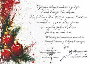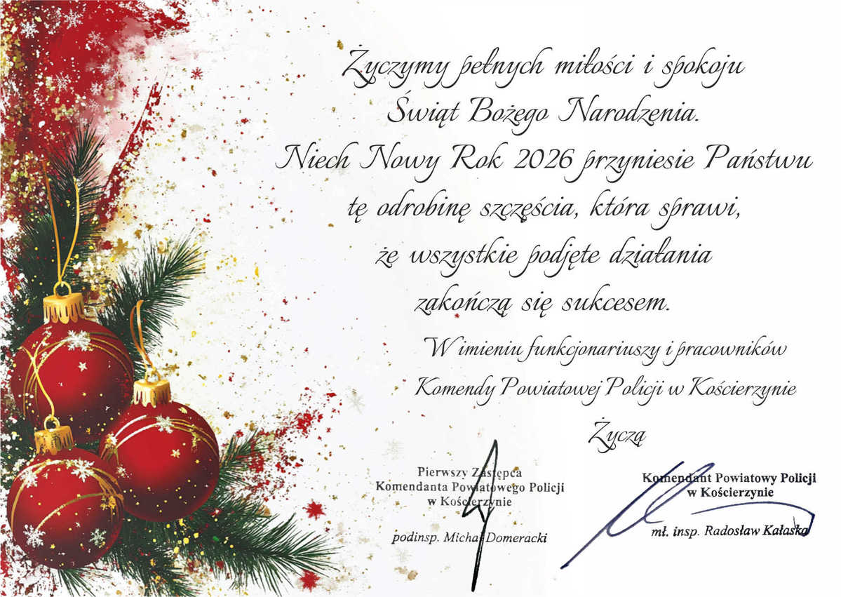 Pragnę, aby w tych dniach wszyscy policjanci i pracownicy Komendy Powiatowej Policji w Kościerzynie, mieli poczucie wspólnej więzi, bezpieczeństwa i wiary, że nadchodzący 2026 rok będzie lepszy dla Nas wszystkich. Jednocześnie wyrażam serdeczne podziękowania za dotychczasową współpracę, ofiarność w służbie oraz wszelkie działania zmierzające do poprawy bezpieczeństwa w powiecie, często kosztem czasu, który powinien być poświęcony rodzinie. Dziękuję więc Waszym najbliższym za wyrozumiałość i wsparcie, których Wam udzielają.