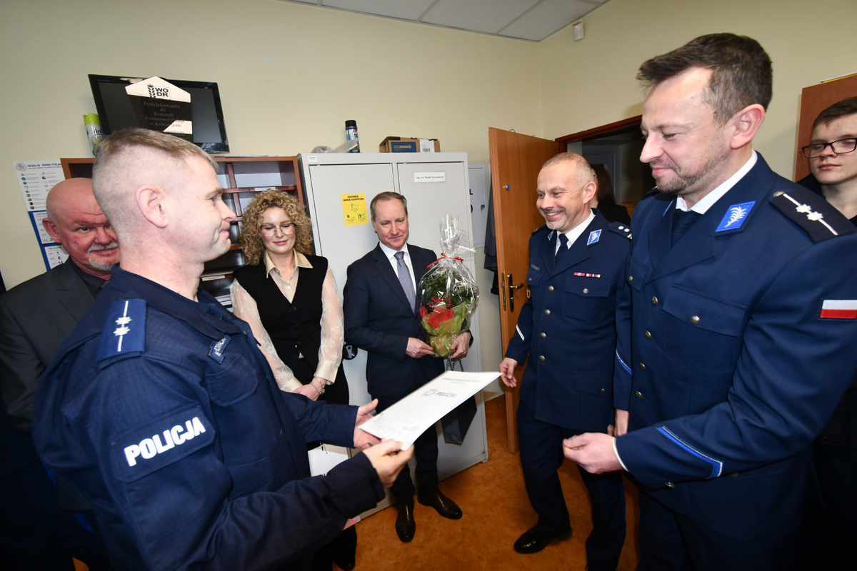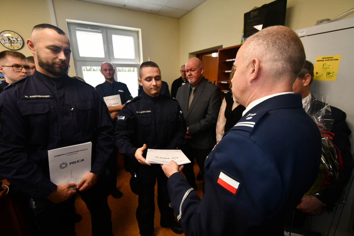 Z dniem 2 stycznia 2026 r. Posterunek Policji w Liniewie został przemianowany na Komisariat Policji w Liniewie w związku ze zmianą struktury organizacyjnej Komendy Powiatowej Policji w Kościerzynie, zatwierdzoną przez Komendanta Wojewódzkiego Policji w Gdańsku. Tego dnia Komendant Powiatowy Policji w Kościerzynie mł. insp. Radosław Kałaska wręczył rozkaz personalny asp. Tomaszowi Zalewskiemu, powołując go na stanowisko Komendanta Komisariatu Policji w Liniewie. Asp. Tomasz Zalewski do tej pory pełnił funkcję kierownika referatu Wykroczeń, Dzielnicowych, Nieletnich i Patologii KPP w Kościerzynie. Podczas uroczystości Komendant Powiatowy Policji w Kościerzynie wyraził przekonanie, że nowo mianowany komendant należycie wypełni swoje obowiązki oraz z powodzeniem sprosta wyzwaniom związanym z pełnieniem służby na nowym stanowisku. W uroczystości uczestniczyli m.in.: I Zastępca Komendanta Powiatowego Policji w Kościerzynie podinsp. Michał Domeracki, Starosta Kościerski Grzegorz Zabrocki, wójtowie gmin Nowa Karczma i Stara Kiszewa oraz Pani Sekretarz Rady Gminy Liniewo. Nowo mianowany Komendant Komisariatu Policji w Liniewie, obejmującego swoim zasięgiem gminy Liniewo, Nowa Karczma i Stara Kiszewa, wręczył mianowania wszystkim funkcjonariuszom pełniącym dotychczas służbę w Posterunku Policji w Liniewie. Otrzymali oni nowe mianowania na stanowiska w Komisariacie Policji w Liniewie. Jednocześnie dotychczasowa kierownik posterunku, st. asp. Edyta Tusk, została mianowana kierownikiem referatu prewencji w Komisariacie Policji w Liniewie. Podczas uroczystości Komendant Powiatowy Policji w Kościerzynie wręczył również nagrody st. sierż. Michałowi Kuczkowskiemu oraz st. post. Wojciechowi Kaszubowskiemu z Komendy Powiatowej Policji w Kościerzynie za wyjątkowe zaangażowanie w służbę. Funkcjonariusze w minionym roku dwukrotnie ratowali życie ludzkie. Po zakończeniu części wewnątrz Komisariatu odbyło się przekazanie nowego pojazdu służbowego dla policjantów, na parkingu. Zakup radiowozu był efektem wspólnego projektu Komendy Głownej Policji, Starostwa Powiatowego w Kościerzynie oraz gmin: Liniewo, Stara Kiszewa i Nowa Karczma. Nowy radiowóz został poświęcony przez kapelana kościerskich policjantów ks. Antoniego Bączkowskiego. Przekazany pojazd to nowoczesny, nieoznakowany samochód marki Kia Sportage, który od dziś patroluje ulice trzech gmin. Auto doskonale sprawdza się zarówno na drogach asfaltowych, jak i w terenie, umożliwiając funkcjonariuszom szybki dojazd do miejsc trudno dostępnych. Zastosowane rozwiązania techniczne znacząco ułatwią codzienną służbę oraz zwiększą skuteczność działań policyjnych.