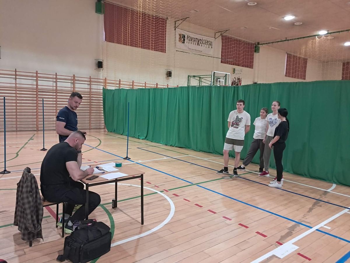 W zeszłym tygodniu policjanci z Komendy Powiatowej Policji w Kościerzynie odwiedzili Powiatowy Zespół Szkół nr 1 w Kościerzynie, gdzie funkcjonuje klasa o profilu policyjnym. Oprócz standardowych zajęć przewidzianych dla szkół średnich, uczniowie zdobywają tam wiedzę z zakresu policyjnego rzemiosła, w tym m.in. wybranych elementów prawa oraz prewencji. Podczas spotkania funkcjonariusze omówili również zasady rekrutacji do Policji. W ostatniej klasie liceum uczniowie mogą dobrowolnie przystąpić do testu sprawności fizycznej. Jego pozytywny wynik jest honorowany w trakcie postępowania kwalifikacyjnego dla kandydatów do służby. Uczniowie mieli okazję zmierzyć się z konkurencjami identycznymi jak te, które muszą zaliczyć osoby ubiegające się o przyjęcie do Policji. Co istotne, egzamin sprawnościowy został zorganizowany w Kościerzynie po raz pierwszy – wcześniej kandydaci musieli wyjeżdżać do ośrodków szkolenia Policji, aby wziąć w nim udział.